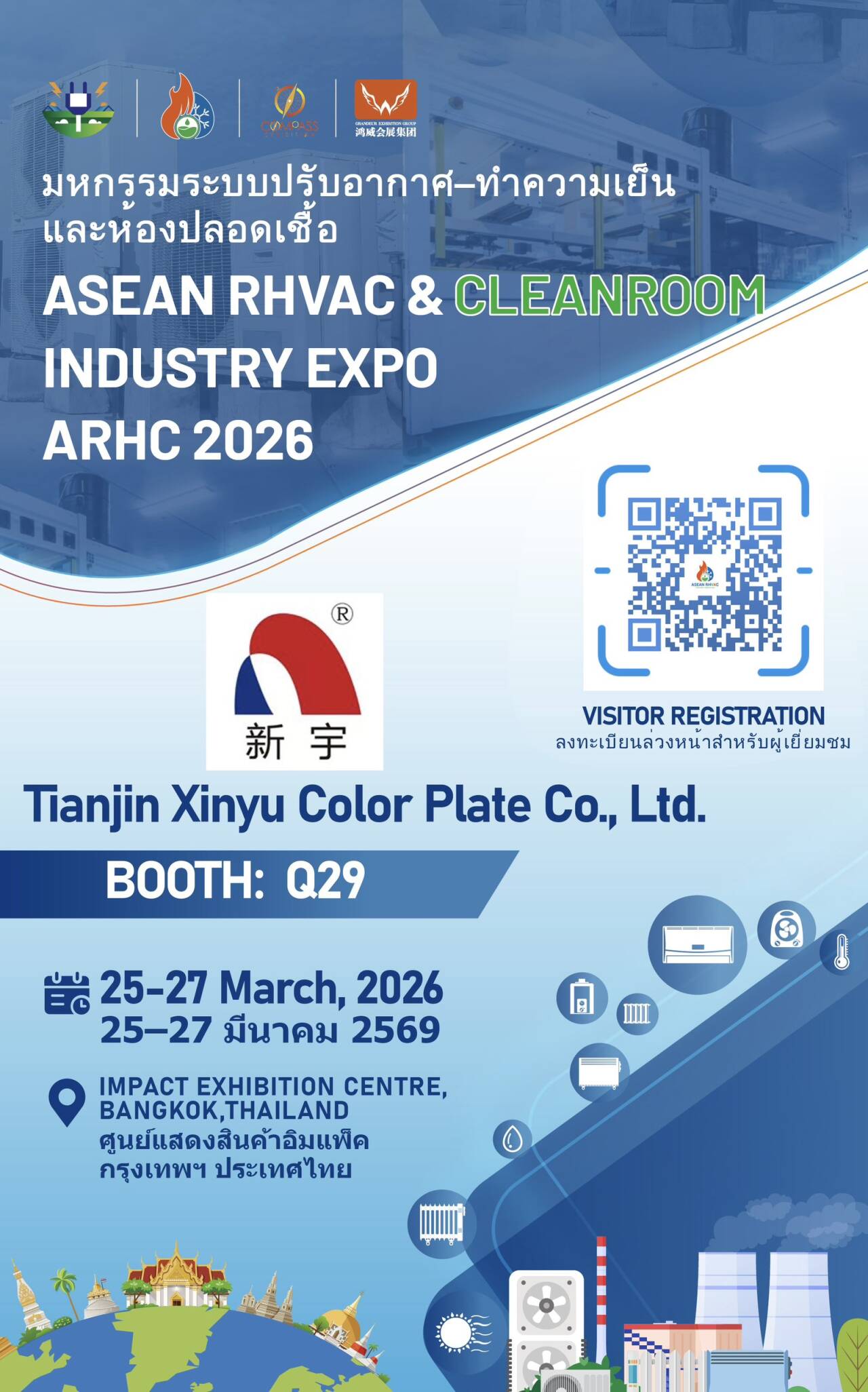 Join ASEAN RHVAC & Cleanroom Industry Expo-ARHC, meet with Tianjin Xinyu Color Plate Co., Ltd. at booth Q29, embrace the booming market of HVACR and cleanroom industry in Bangkok, Thailand!